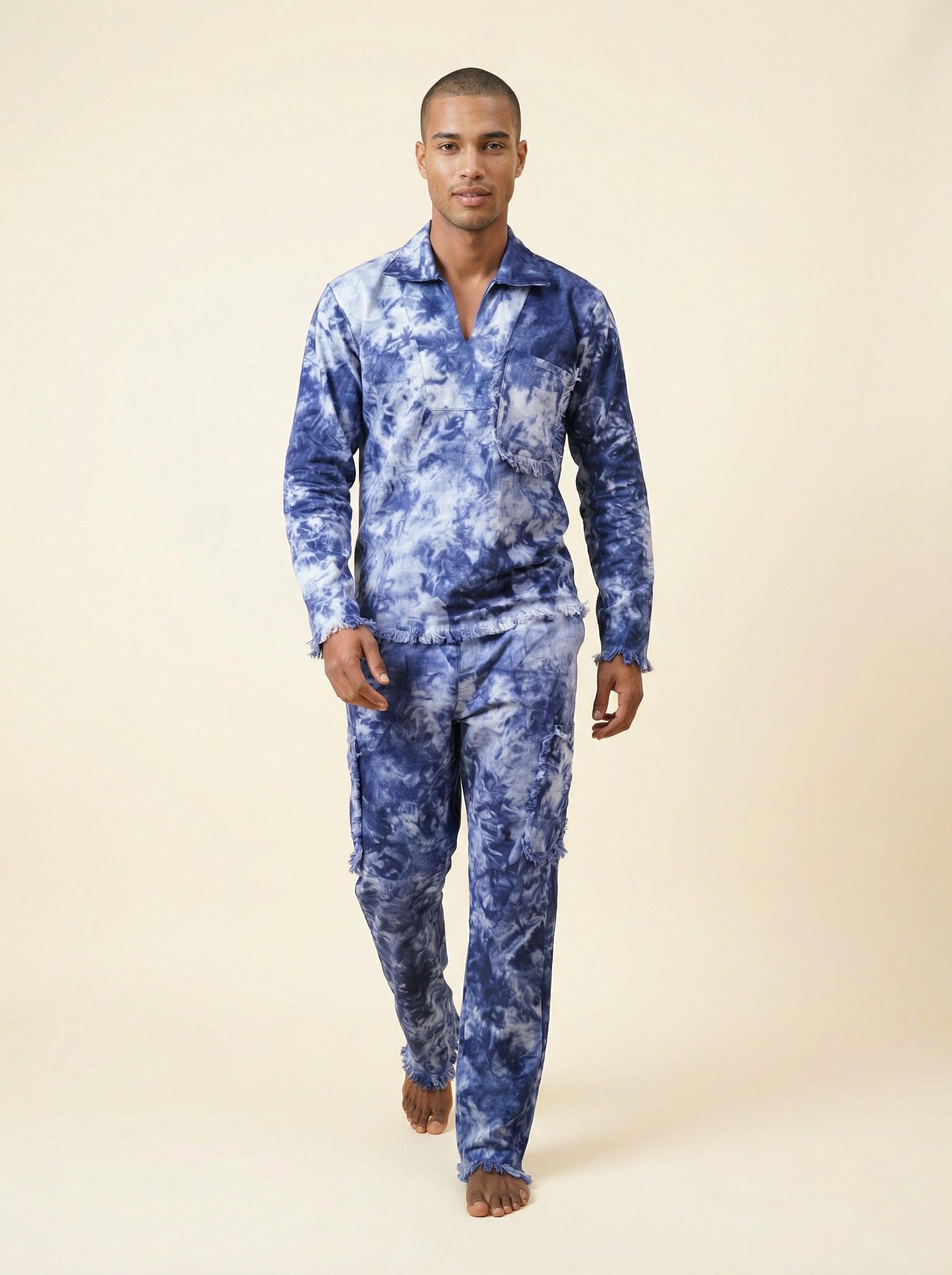 A bold two-piece set in 100% cotton featuring a splash-dye finish, a relaxed open-collar long-sleeve top with raw-edge detailing, and matching straight-leg pants. Effortlessly cool, breathable, and designed to stand out with ease.