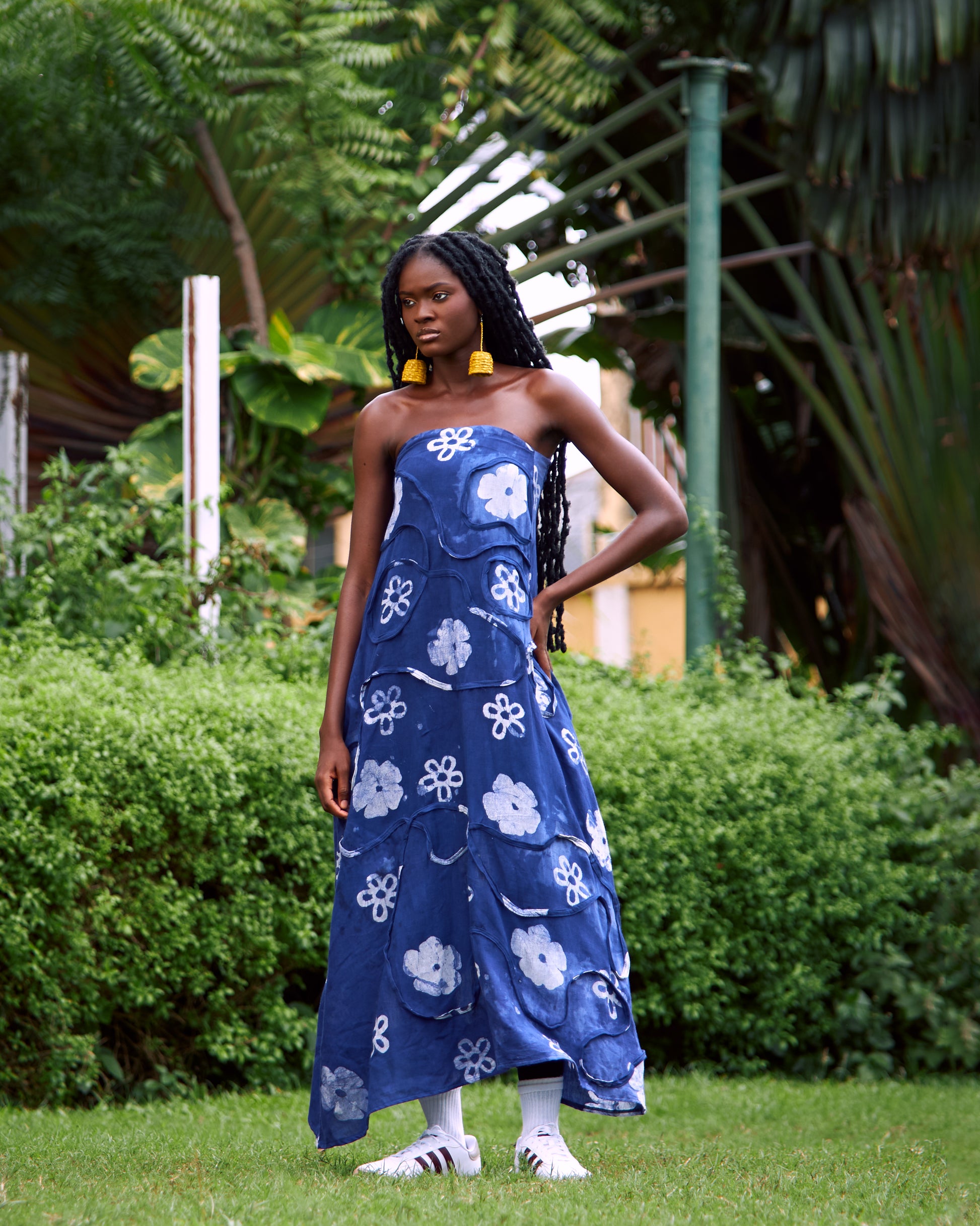 A flowing Funtua cotton dress, hand-dyed in indigo batik with playful floral patterns. Effortlessly elegant and versatile for both casual and elevated styling.