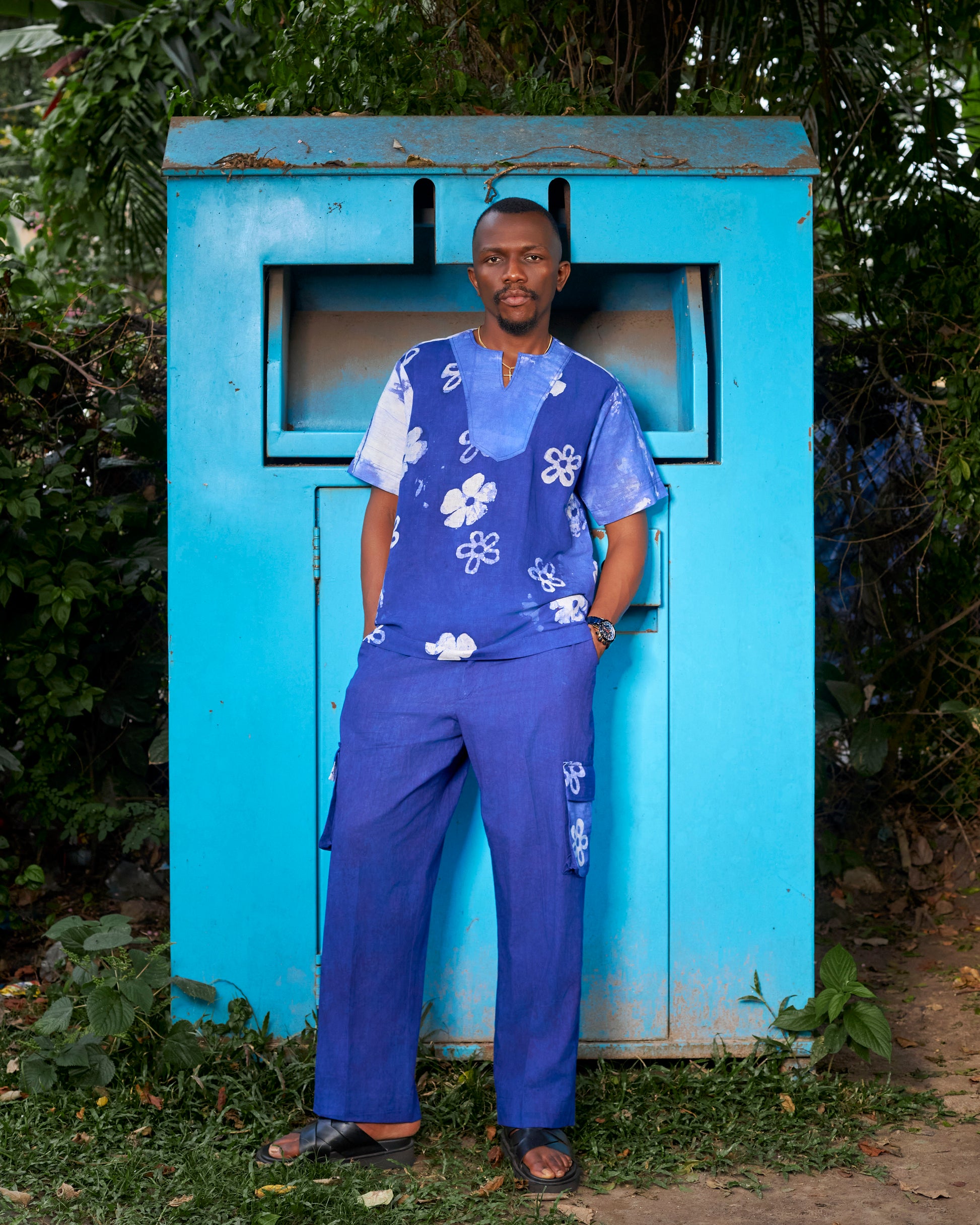 The Ibra Set is a hand-dyed two-piece featuring a short-sleeve tunic top with a notch neckline and matching straight-leg trousers. Adorned with white floral motifs on deep indigo, the design blends playful patterns with refined tailoring. Functional side pockets and cargo-style details add versatility, making this set ideal for casual days or standout cultural moments.