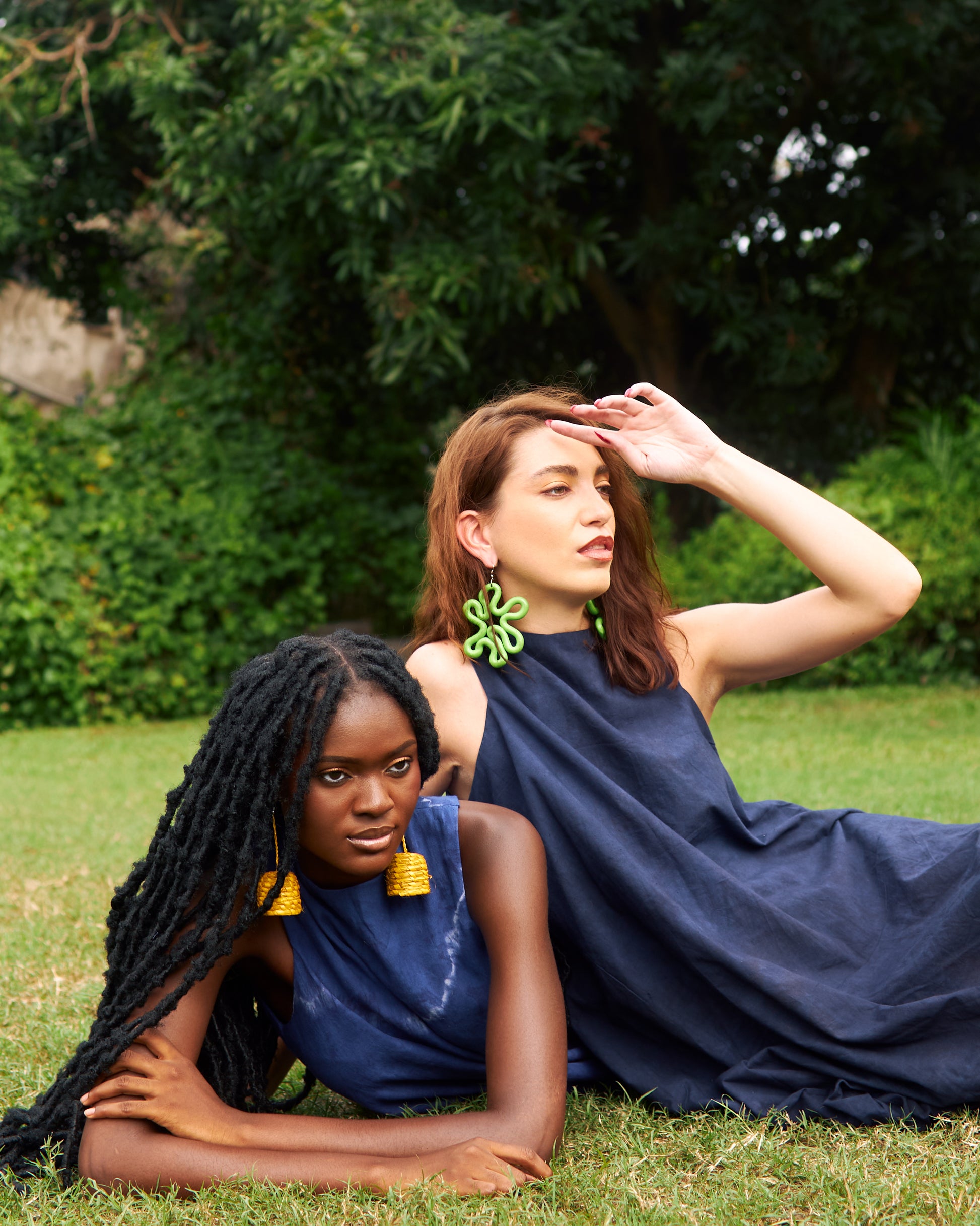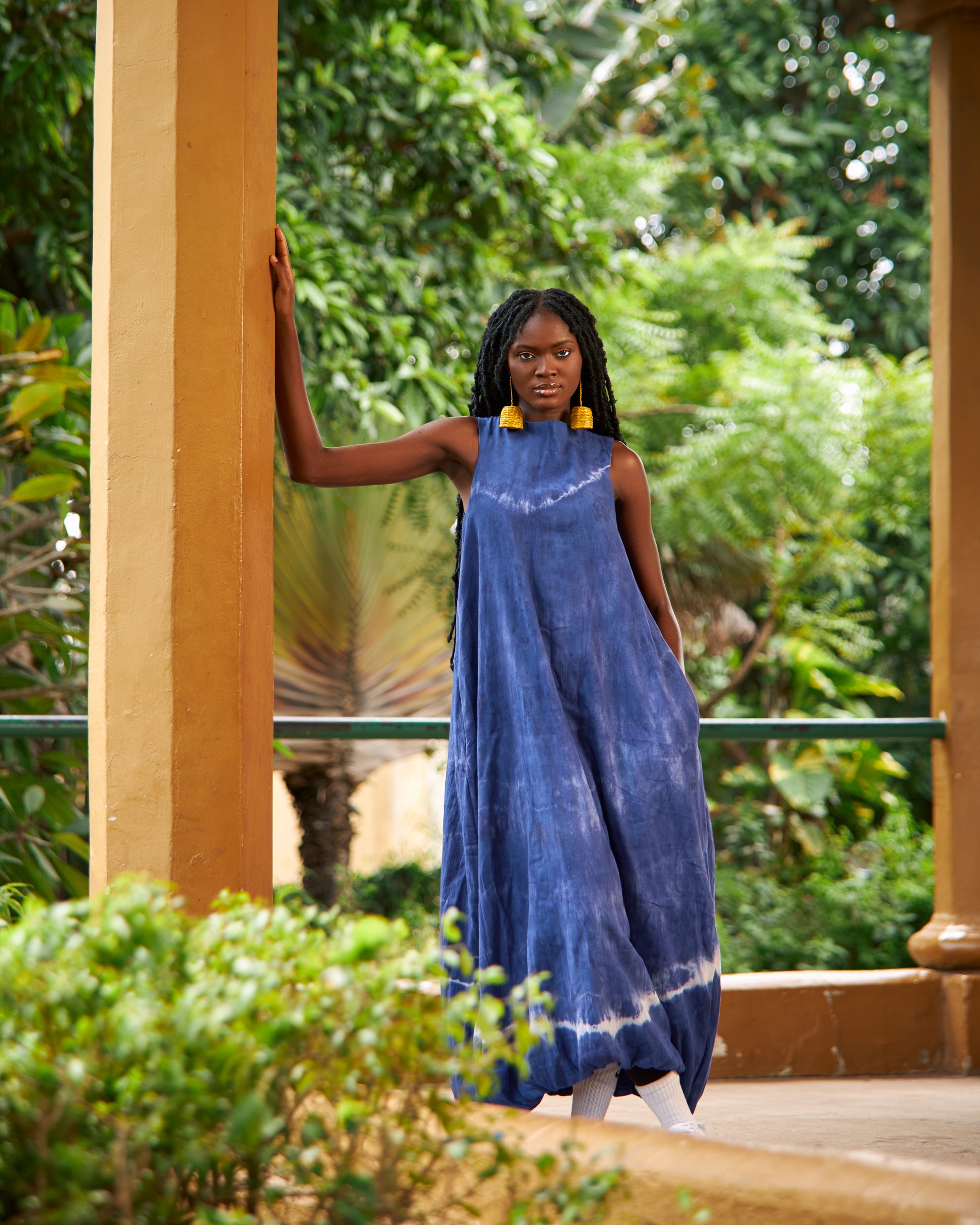 A sleeveless indigo balloon dress, hand-dyed with subtle tie-dye detailing across the chest and hemline. Designed with a rounded cocoon silhouette and gathered hem, it offers both structure and flow, making it a modern statement piece rooted in traditional craft. Effortlessly versatile, it can be styled casually with sneakers or elevated with bold accessories.