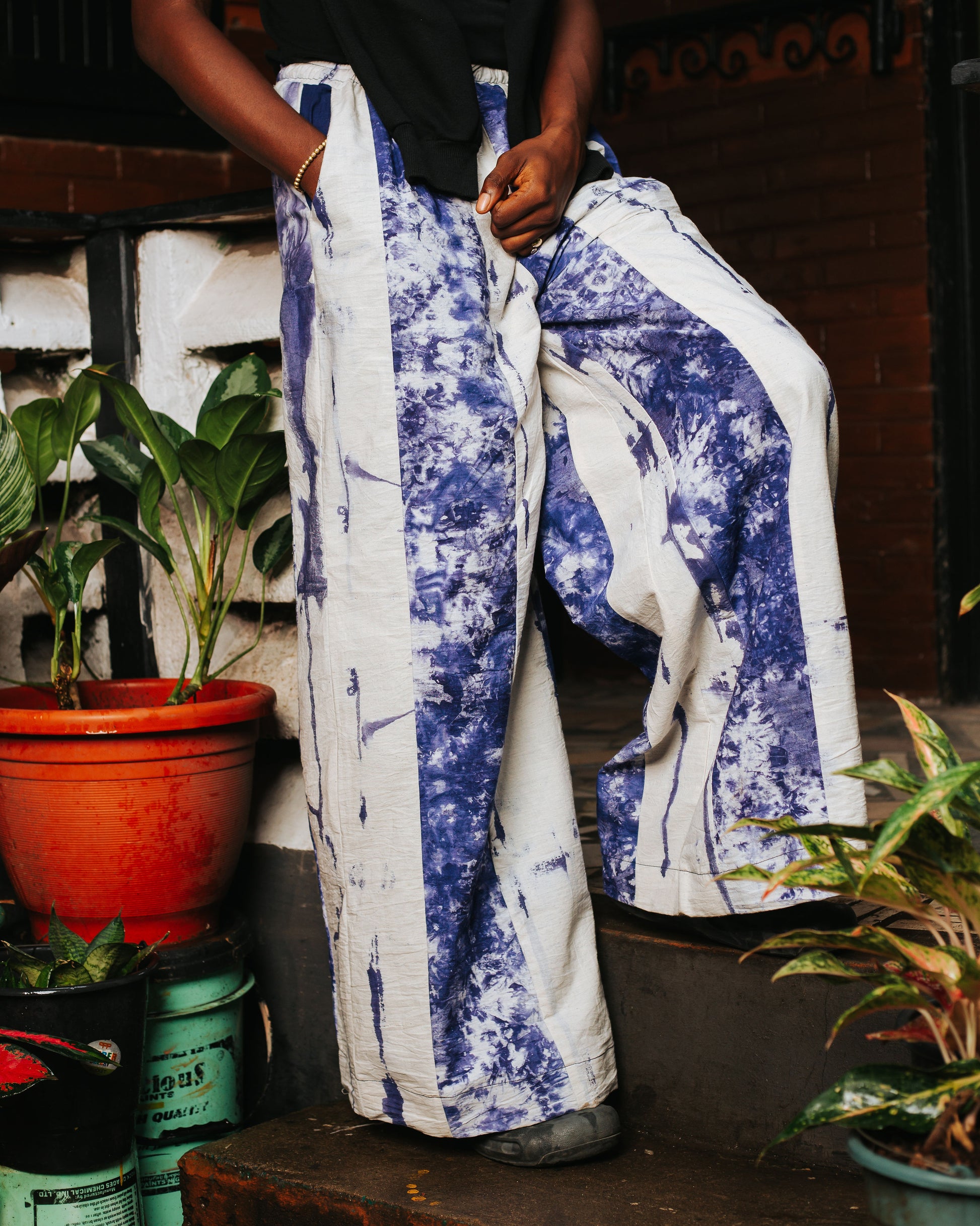 These wide-leg pants were hand-dyed using traditional techniques, each piece carries unique patterns of deep indigo on a natural cotton base, creating a striking contrast that celebrates African artistry. The pants feature an oversized silhouette with flowing volume, designed for comfort and effortless movement. Crafted from breathable, textured cotton, they’re perfect for both casual and statement looks, pairing easily with neutral or patterned tops.