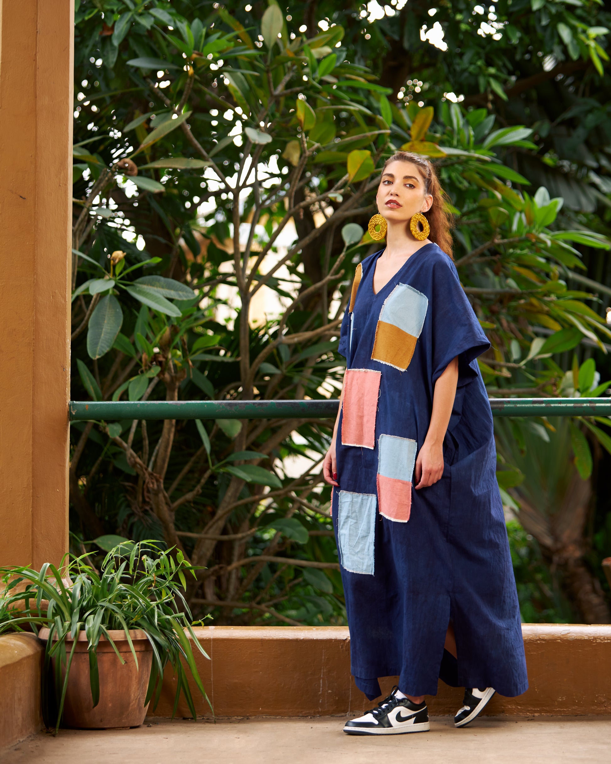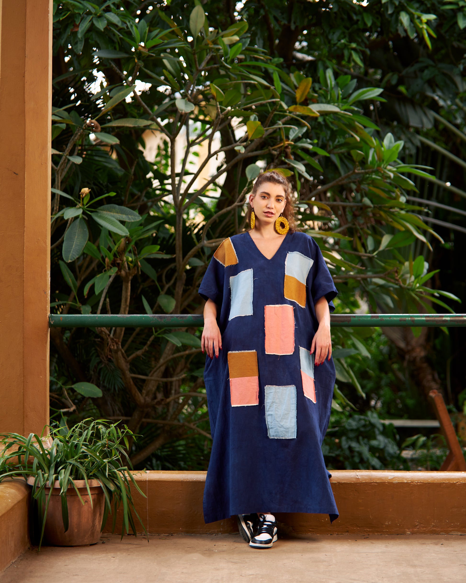 A loose-fit indigo kaftan dress featuring a relaxed V-neckline, short sleeves, and bold patchwork accents crafted from denim and earthy-toned fabrics. With its mix of pastel and rustic hues, the dress blends contemporary artistry with traditional craft, offering a statement look that is both stylish and effortlessly comfortable
