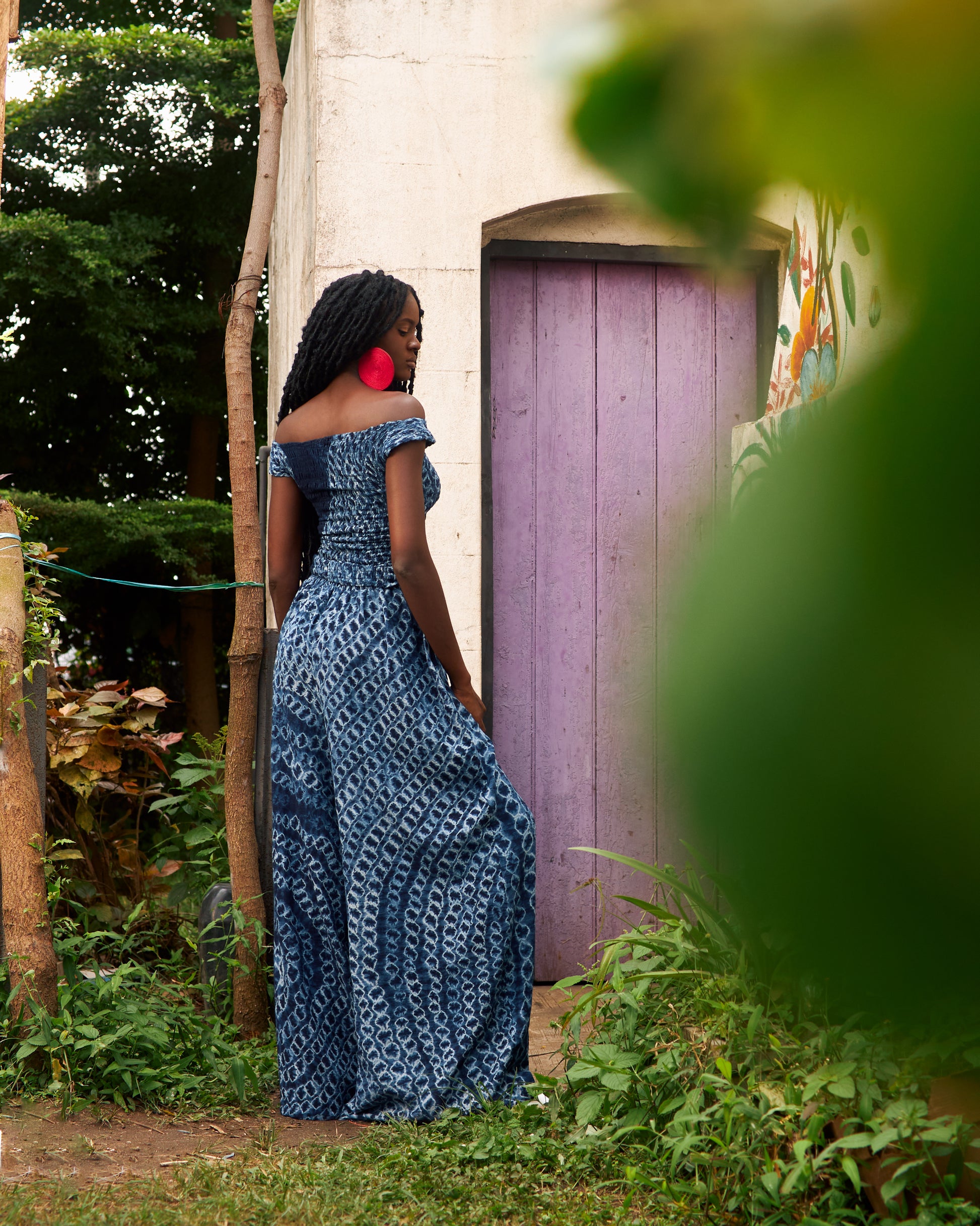 Made from Funtua cotton and hand-dyed in a striking batik pattern, this off-shoulder top features a smocked bodice that hugs the waist for a flattering fit. Perfect for both casual outings and statement looks.