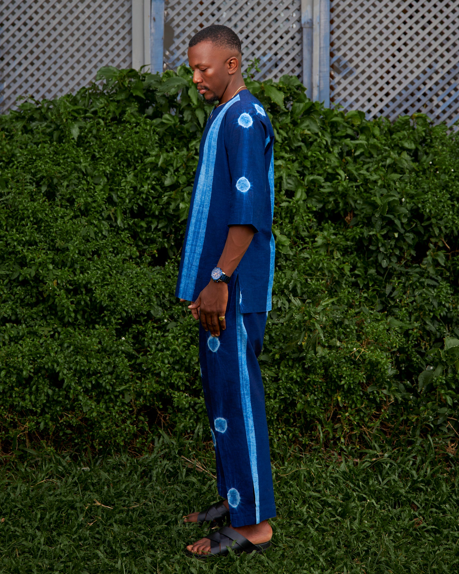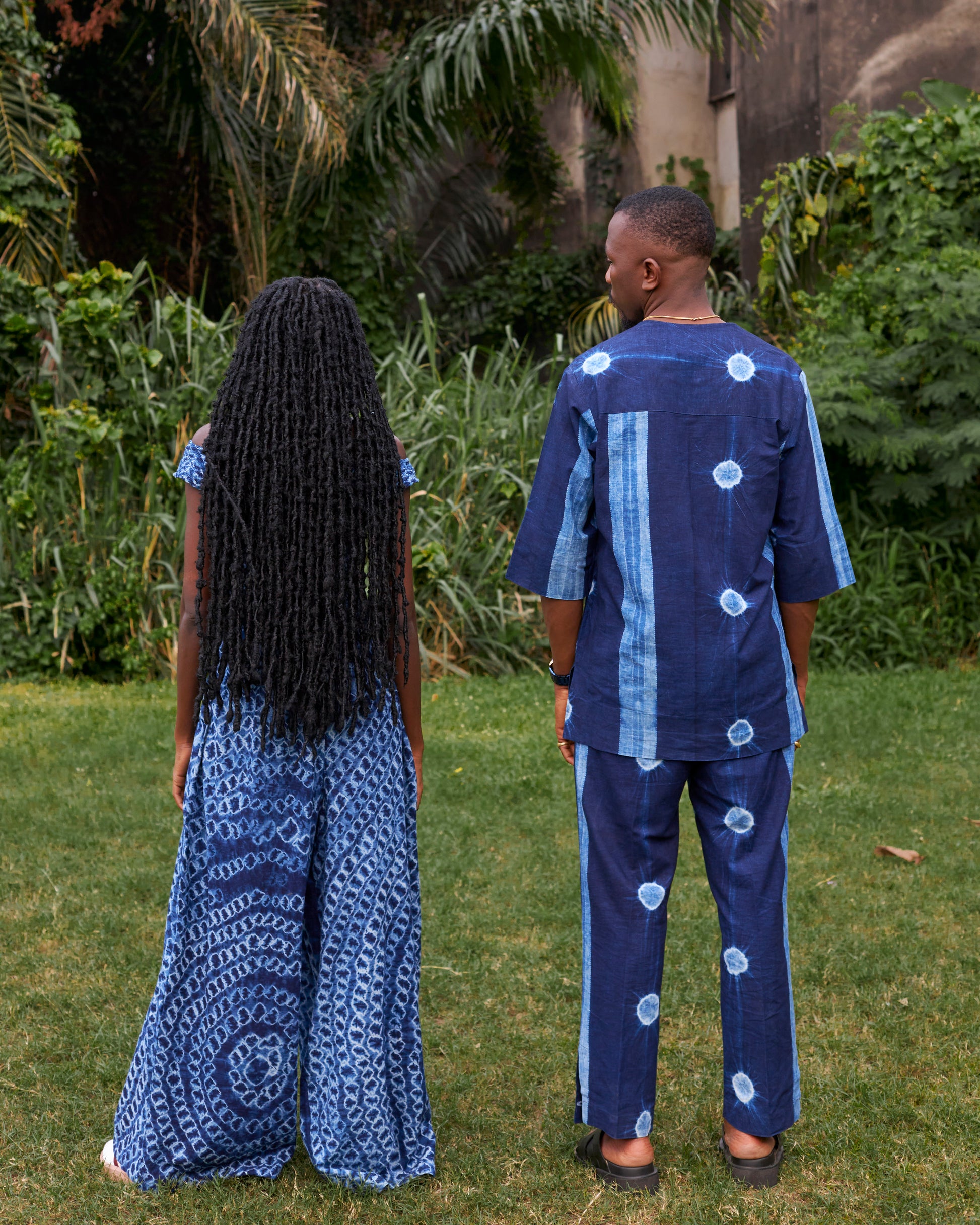 Cut from Funtua cotton and hand-dyed with natural indigo, this tunic features a relaxed fit with three-quarter sleeves and a notched neckline. The vertical patterns and circular motifs add a bold, artisanal touch.