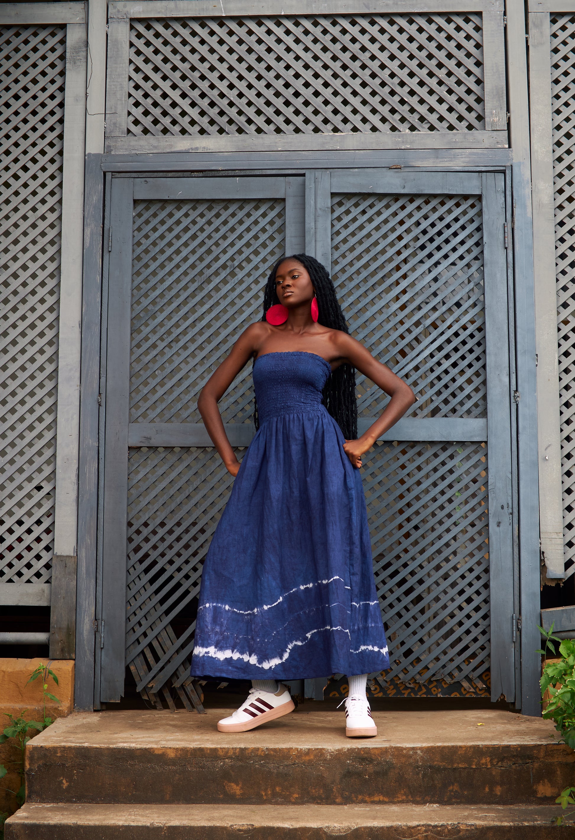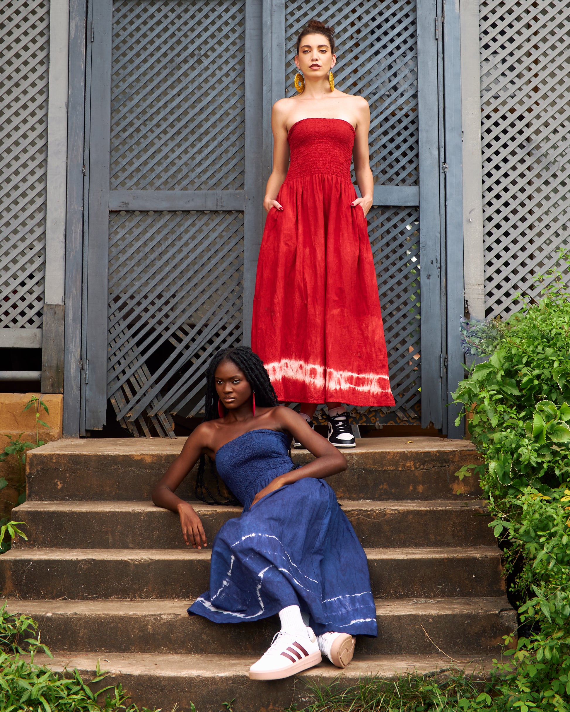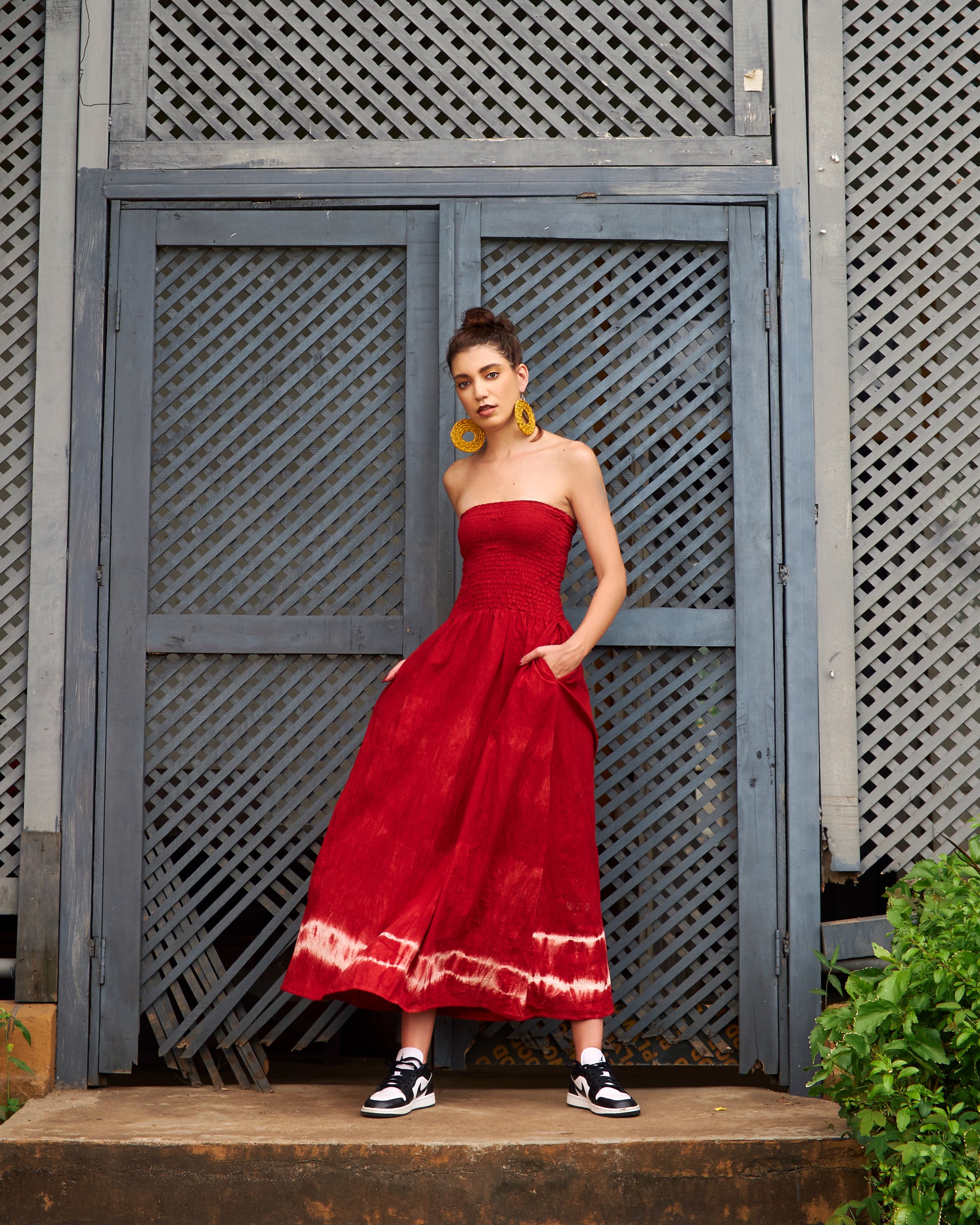 A strapless, hand-dyed cotton maxi dress featuring a smocked bodice for comfort and a flowing silhouette. Finished with a tie-dye border at the hem, it blends effortless style with cultural craftsmanship. Perfect for casual wear or dressed up with bold accessories.